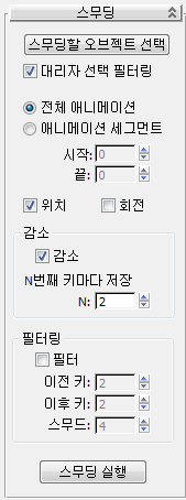 기본적으로 스무딩은 키를 줄여 작동합니다. 옵션으로, 기존 애니메이션 키를 필터링(평균화)하여 더 점진적으로 변경되고 모션이 더 자연스러워지도록 할 수도 있습니다.