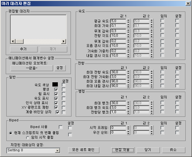 이 매개변수는 대리자 오브젝트의 모션 매개변수 롤아웃에 있는 설정과 동일합니다. 임의 및 설정 확인란에 대한 설명은 이 항목의 소개를 참조하십시오.