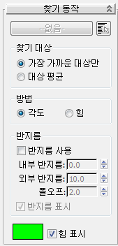 선택사항인 반경 설정을 이용하여 대표가 대상으로부터 특정 거리 내에 있을 때에만 찾기 동작을 활성화시킵니다. 찾기 동작의 상대적 강도는 외경 너머의 0%부터 내경에서의 100%까지 증가합니다.