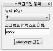 스크립트된 동작은 MAXScript를 이용하여 사용자 정의 동작을 생성할 수 있게 합니다. 스크립트된 동작은 힘, 제약 조건 또는 방향의 세 가지 동작 유형 중 하나를 포함할 수 있습니다.