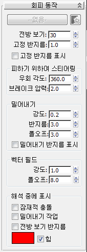 - "밀어내기" 회피가 감지되고 수행되는 대리자의 경계 구로부터의 최대 거리입니다. 기본값은 3.0입니다.