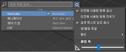 팁: 검색 막대 창을 3ds Max 인터페이스에 도킹할 수 있습니다. 창으로 토글한 후, 창을 마우스 오른쪽 버튼으로 클릭하고 도킹 > 맨 위, 맨 아래, 왼쪽 또는 오른쪽 중에서 선택하여 언제든지 액세스할 수 있도록 검색 창을 도킹할 수 있습니다.