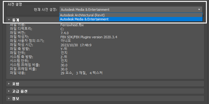 Autodesk Architectural(Revit) 사전 설정은 간단한 FBX UI 버전입니다. 이 사전 설정에는 Autodesk Revit 응용 프로그램의 데이터를 Autodesk 3ds Max로 변환하는 아키텍처 작업 흐름에 가장 적합한 설정이 있습니다. 이 사전 설정에서는 옵션이 표시되지 않으며 사전 설정과 통계 섹션만 표시됩니다. 이 사전 설정에는 Revit에서 3ds Max로의 워크플로우에 필요한 기본 설정이 모두 들어 있지만 필요한 다른 모든 설정이 포함되도록 사전 설정을 편집할 수 있습니다. 사전 설정 편집/저장을 참조하십시오.