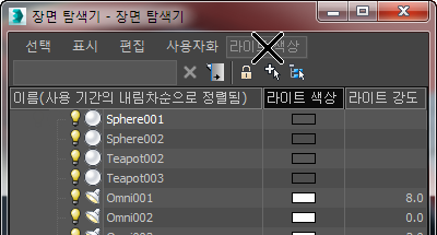 장면 탐색기에서 열 바꾸기(이름을 제외한 모든 열):