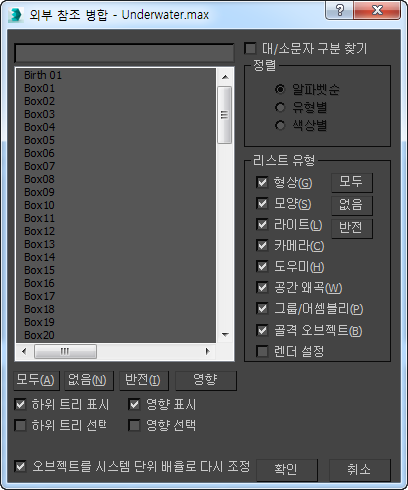 외부 참조 병합 대화상자를 사용하면 장면에 외부 참조 오브젝트로 추가할 오브젝트를 선택할 수 있습니다. 이 작동은 병합 명령과 유사합니다.