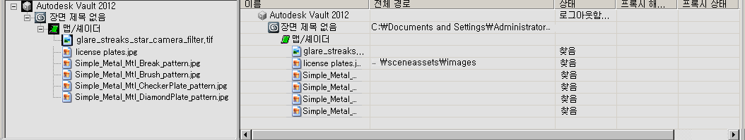 또한 각 자산의 아이콘이 표시되어 자산(3ds Max 장면 파일, 맵 분기 등) 유형과 상태를 적절히 나타냅니다. 대부분의 상태 아이콘은 Vault 탐색기 도움말