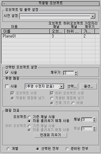 설정하면 채널 및 채우기 컨트롤이 개별 오브젝트, 선택한 모든 오브젝트 및 준비된 모든 오브젝트에 사용됩니다. 해제되어 있으면 선택한 오브젝트 텍스처 렌더링에서만 이러한 설정을 사용하고 "전체 장면" 렌더링에서는 사용하지 않습니다. 기본적으로 해제되어 있습니다.