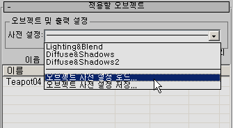 이 드롭다운 리스트를 사용하면 단일 오브젝트에서 맵 유형 및 크기를 포함하여 모든 현재 텍스처로 렌더링 설정을 구성하는 사전 설정을 저장한 다음 사전 설정을 다른 많은 오브젝트에 로드할 수 있습니다. 텍스처로 렌더링 사전 설정은 RTP 파일 이름 확장자를 사용합니다. 사전 설정에는 적용할 오브젝트 및 출력 롤아웃과 투영 옵션 대화상자의 모든 설정이 포함됩니다. 유일한 예외는 적용할 오브젝트 롤아웃 투영 매핑 그룹의 오브젝트 수준 및 하위 오브젝트 수준 라디오 버튼과 적용할 오브젝트 롤아웃 매핑 좌표 그룹의 자동 둘러싸기 해제 사용 채널 숫자 값입니다.