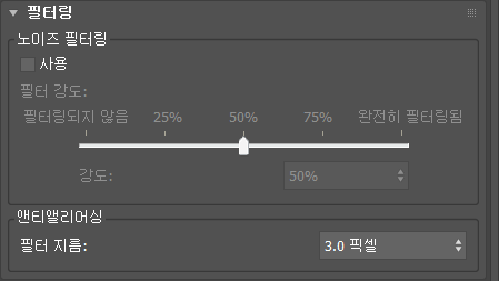 - 앤티앨리어싱 필터의 지름을 설정합니다. 이 값을 늘리면 렌더링된 이미지에 블러가 추가되지만 거친 가장자리가 매끄러워집니다.