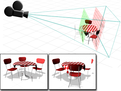 형상을 제외하지 않고 원거리 평면을 사용하여 오브젝트를 제외하도록 카메라에 가까운 단거리 클리핑 평면을 설정할 수 있습니다. 마찬가지로 형상을 제외하지 않고 단거리 평면을 사용하여 오브젝트를 제외하도록 카메라에서 충분히 멀리 원거리 클리핑 평면을 설정할 수 있습니다.