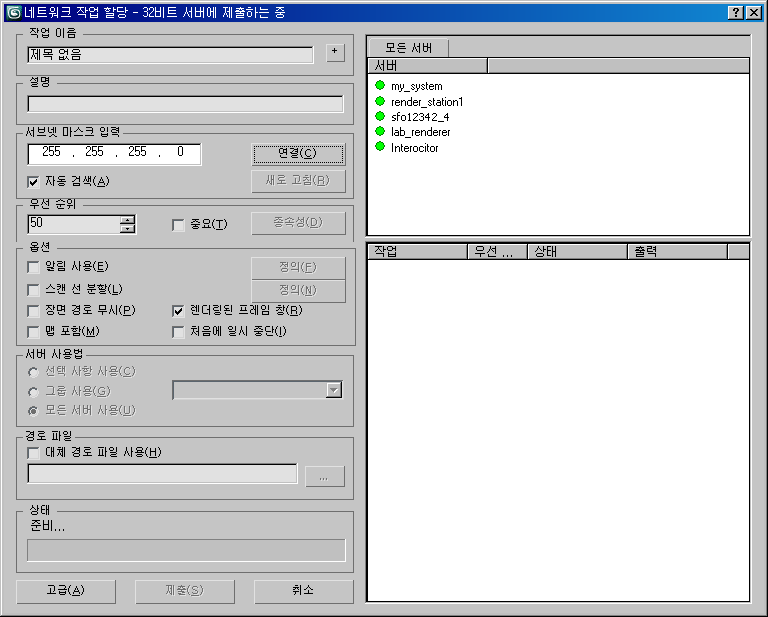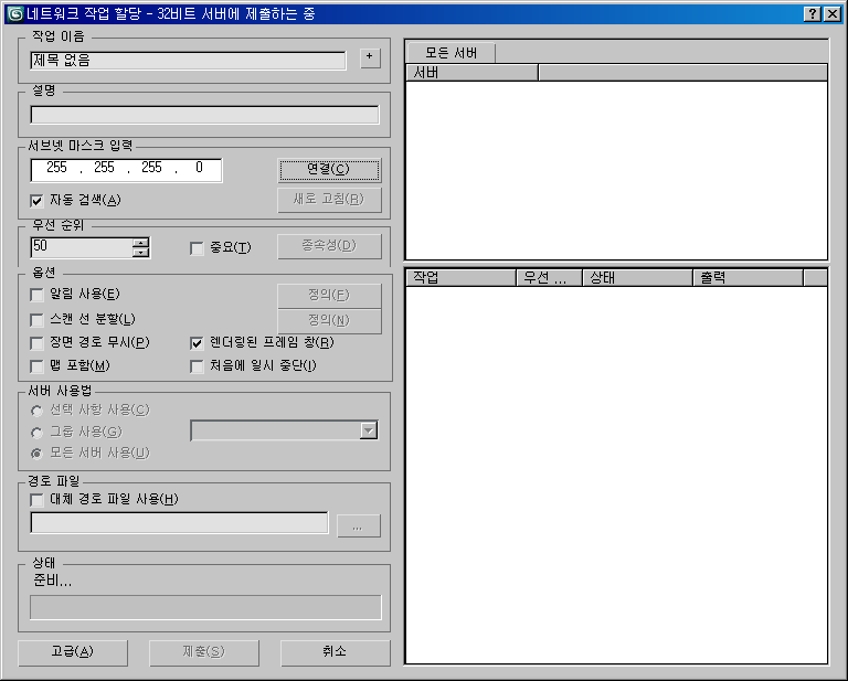 렌더 팜을 사용하려면 스틸 이미지 파일 형식(예: 일련의 BMP 파일)으로 프레임 시퀀스를 출력해야 합니다. AVI 또는 MOV와 같은 애니메이션 파일 형식을 다중 시스템으로 렌더링할 수는 없습니다. 애니메이션 파일은 단일 시스템으로 렌더링해야 합니다. 애니메이션 파일 형식으로 렌더링하는 경우 네트워크 작업 할당 대화상자의 모든 서버 사용 확인란을 사용할 수 없습니다.