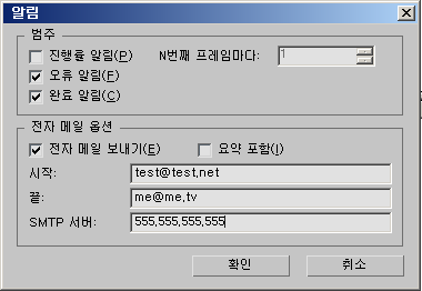 이 대화상자에서는 네트워크 렌더링 작업에서 전자 메일을 통해 알림을 보내도록 할 수 있습니다. 이러한 알림은 애니메이션과 같은 매우 긴 렌더링을 시작할 때 및 네트워크 관리자 시스템 근처에서 모든 시간을 소비하지 않으려는 경우에 유용할 수 있습니다.