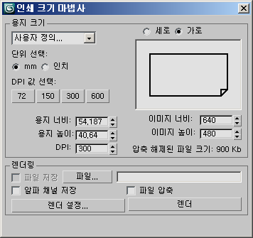 인쇄 크기 마법사에서 직접 렌더링하여 TIFF 형식에서 현재 프레임을 디스크 파일로 출력할 수 있습니다. 이러한 형식은 출판 업계에서 흔히 사용됩니다. 다른 형식으로 렌더링하려면 마법사의 렌더 설정 버튼을 사용합니다.
