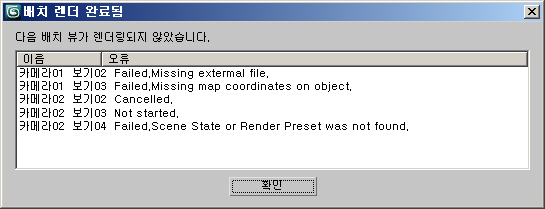 이 대화상자는 완료되지 않은 배치 렌더를 알려 줍니다. 가능한 경우 오류가 발생한 사유에 대한 설명을 제공합니다.
