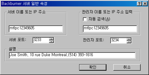 서버 일반 특성 대화상자에는 네트워크 렌더링 서버의 구성 설정이 들어 있습니다. 이 대화상자의 기본 설정은 대부분의 경우에 작동하지만 자동 검색이 실패하는 대부분의 관리자 또는 IP 설정과 같은 특정 상황에서는 이러한 설정을 조정해야 합니다. 서버 특성 대화상자에 지정된 정보는 backburner.xml 파일(₩Network 하위 디렉토리)에 있습니다. 존재하지 않거나 서버와 관련된 정보가 없는 서버 및 backburner.xml 파일을 실행하면 backburner.xml 파일이 생기거나 업데이트됩니다.