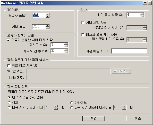 기본 작업 처리 그룹의 설정을 사용하면 사용자는 완료된 작업을 x일 후에 지정된 위치에 보관하고, 완료된 작업을 x일 후에 삭제하거나 작업을 그냥 대기열에 무기한으로 둘 수 있습니다.