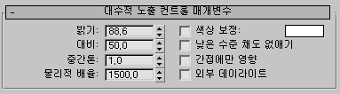 대수 노출 컨트롤에서는 밝기, 대비 및 일광 실외 장면인지 여부에 따라 물리적 값을 RGB 값에 매핑합니다. 이 컨트롤은 기본 스캔라인 렌더러와 함께 사용할 수 있습니다. 대수 노출 컨트롤은 역학 범위가 매우 높은 장면에 가장 적합합니다.