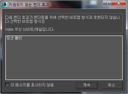 3ds Max에서 제공되는 렌더링된 이미지 효과 대부분이 32비트 부동 소수점 출력과 호환되지 않습니다. 지원되지 않는 하나 이상의 효과를 사용하여 렌더링하는 경우 다음 대화상자가 나타납니다.