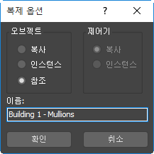 1. 을 사용해 글레이징 오브젝트(탑)을 선택합니다. 메뉴모음에서 편집 복제를 선택합니다. 복제 옵션 대화상자 오브젝트 그룹에서 참조를 선택합니다. 오브젝트의 이름을 Building 1 - Mullions로 변경한 다음 확인을 클릭합니다.