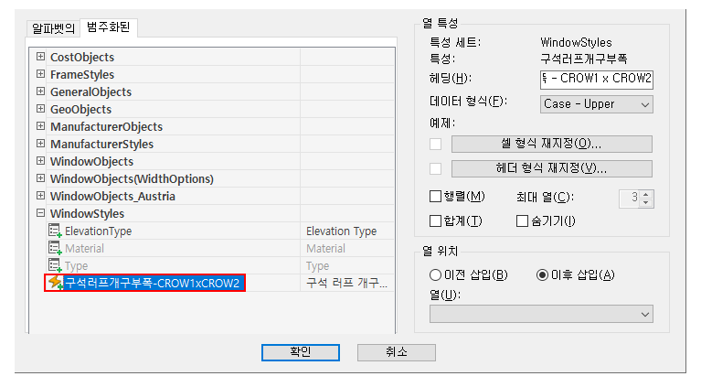 8. 열 추가 대화상자의 창 스타일에서 구석 러프 개구부 폭 – CROW1 x CROW2를 선택합니다.