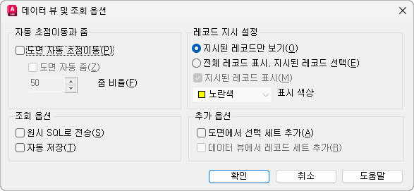 데이터 뷰 윈도우에서 해당 레코드를 선택할 때 링크된 객체가 현재 도면에 표시되는 방법을 조정합니다.