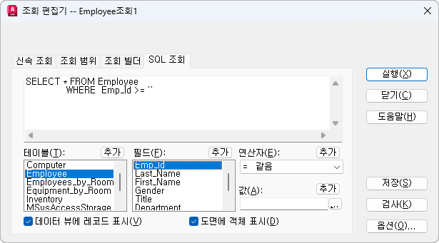자유 형식 SQL 조회를 입력하거나 다양한 SQL 조회 도구를 사용하여 선택한 요소를 추가할 수 있는 공간을 제공합니다.
