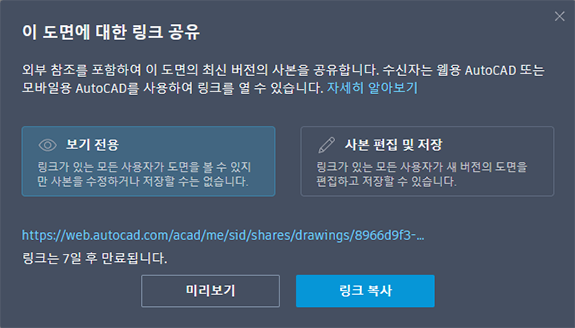 웹(web.autocad.com) 또는 모바일의 AutoCAD에서 보거나 편집하려면 현재 도면의 사본에 대한 링크를 공유합니다. 도면 사본에는 모든 외부 참조 및 이미지가 포함됩니다.