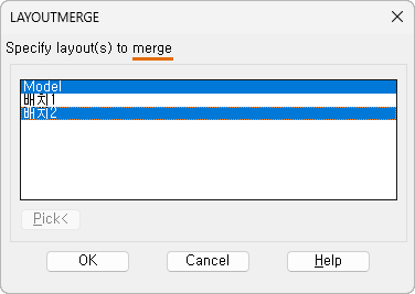 명령행 버전 -LAYOUTMERGE도 사용할 수 있습니다. 다음과 같은 프롬프트가 표시됩니다.