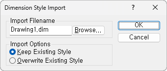 Import Options 현재 도면의 치수 스타일을 유지하는 Keep the Existing Style 및 현재 도면의 스타일을 덮어쓰는 Overwrite Existing Style이 있습니다. Keep the Existing Style 옵션은 가져올 때 이름이 유사한 스타일을 무시하는 반면, Overwrite Existing Style은 이름이 유사한 스타일을 사용합니다.