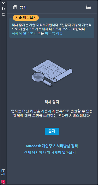탐지 팔레트는 도면을 스캔하고 식별된 객체를 블록 변환으로 검토하는 옵션을 제공합니다.