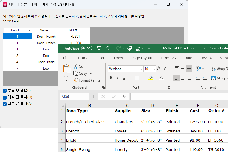 Excel 스프레드시트에 저장한 정보를 추출한 도면 데이터(객체 특성 데이터)와 링크하여 결합할 수 있습니다. 위의 예제를 계속 살펴보겠습니다. 도면의 출입구에 대한 일부 추가 정보(공급자 및 비용)가 Excel 스프레드시트에 들어 있다고 가정합니다. 이 경우 스프레드시트에서 공급자 및 비용에 대한 열을 선택하고 이들 열을 데이터 추출의 다른 데이터와 결합합니다.