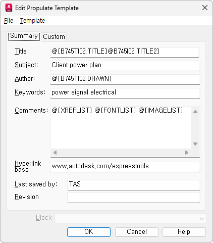 | @[block.attributeTag] | 속성 블록에서 속성 태그 값을 추출하여 지정된 필드에 삽입합니다. 예를 들어 작성자 필드에 @[title.drawnby]를 삽입하면 Propulate가 도면에서 속성 블록 명명된 제목을 검색하고, drawnby 속성 필드 값을 추출하여 도면의 도면 특성 대화상자에 있는 작성자 필드에 삽입합니다. 전체 프로젝트에서 공통 블록을 사용하는 경우에는 더 많은 도면에서 해당 특정 속성 값을 반영하도록 업데이트하는 작업이 간편해집니다. |