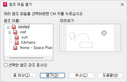 외부 참조가 내포된 경우 선택한 도면 참조(외부 참조)를 새 윈도우에서 엽니다.