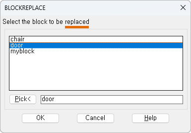 리스트에서 블록 이름을 선택하거나 선택 버튼을 클릭하고 도면에서 블록을 선택하여 검색할 블록 이름을 지정합니다.