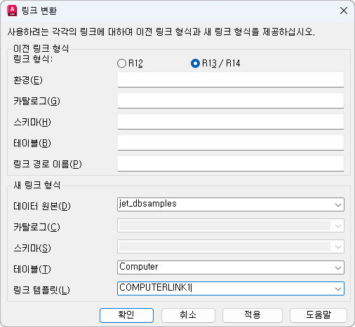 변환할 링크의 형식을 지정합니다. R12와 R13/R14 중 어느 것을 선택하는가에 따라 다른 필드가 표시됩니다.