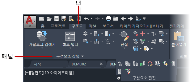 회로 빌더 선택 경로에서 구조도는 탭 이름이고, 구성요소 삽입은 탭의 패널 이름이며, 회로 빌더는 명령 이름입니다.