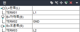라이브러리 기호의 와이어 연결 지점 및 터미널 문자를 정의할 수 있습니다. 와이어 연결을 추가할 경우 스타일, 와이어 연결 시작 방향, 선택적 TERMxx 및 TERMDESCxx 속성을 포함할지 여부를 선택합니다. 이 연습에서는 와이어 연결 속성을 기호의 왼쪽, 아래쪽 및 오른쪽에 삽입합니다.
