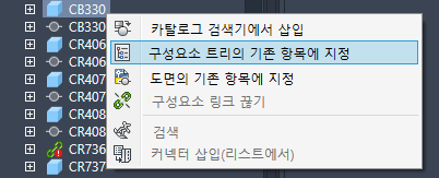 위치 뷰 탭에서 Inventor 부품을 마우스 오른쪽 버튼으로 클릭하고 구성요소 트리의 기존 항목에 지정을 클릭합니다.