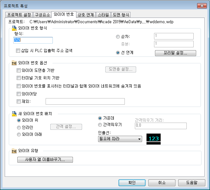 프로젝트 특성 또는 도면 특성 대화상자를 사용하여 프로젝트 또는 도면 기본값, 구성요소, 와이어 번호, 상호 연계, 스타일 및 도면 형식에 대한 설정을 지정할 수 있습니다. 각 탭에 대해 사용할 수 있는 옵션의 개요는 다음 섹션에 나열됩니다.