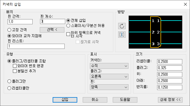 지금까지 삽입한 커넥터 핀이 대화상자에 표시됩니다. 다음 연결 삽입을 계속 클릭하여 9개의 연결 중 6개를 배치합니다.