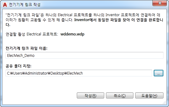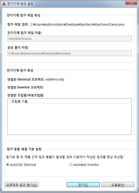 AutoCAD Electrical 도구 세트 프로젝트를 Inventor 프로젝트에 연결하는 전기기계 링크 파일을 작성합니다.