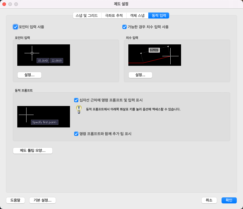 포인터 입력, 치수 입력, 동적 프롬프트 및 제도 툴팁의 모양을 조정합니다.