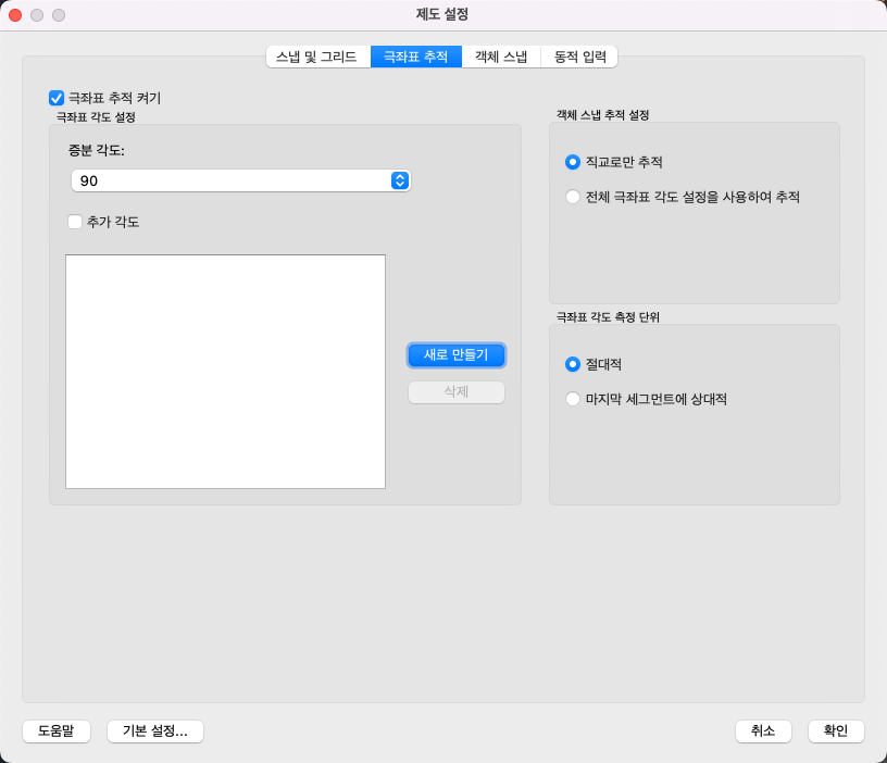 극좌표 추적 설정을 객체 스냅 추적에 적용합니다. 객체 스냅 추적을 사용하면 커서가 지정된 객체 스냅 점에서 극좌표 할당 각도를 따라 추적합니다. (POLARMODE 시스템 변수)