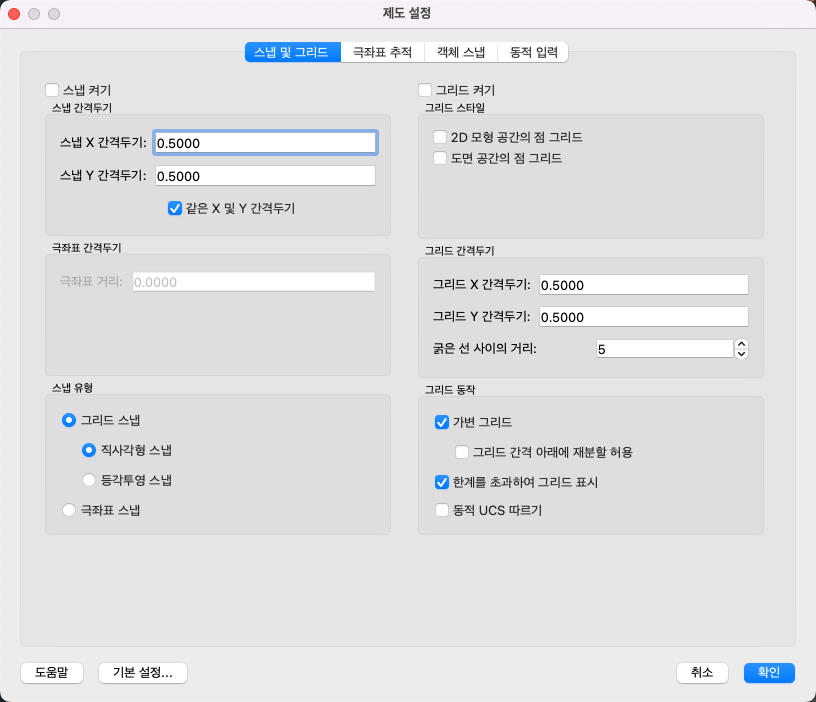 스냅 간격두기 및 그리드 간격두기에 대한 X 및 Y 간격을 강제로 동일하게 만듭니다. 스냅 간격두기의 간격은 그리드 간격두기의 간격과 다를 수 있습니다.