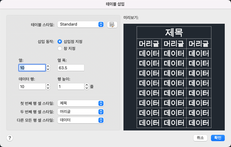 테이블의 첫 번째 행에 대한 셀 스타일을 지정합니다. 기본적으로 제목 셀 스타일이 사용됩니다.