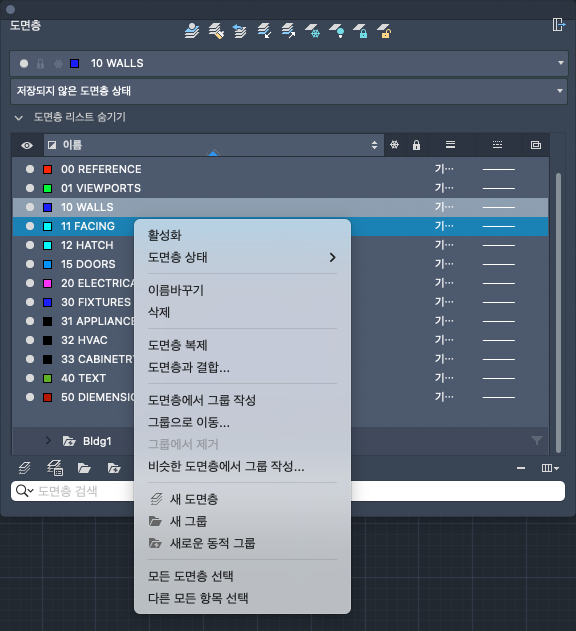 도면층 리스트를 사용하여 도면층 특성을 수정합니다. 현재 설정을 클릭하여 선택한 도면층 또는 도면층 그룹의 도면층 특성을 변경합니다. 또한 도면층을 두 번 클릭하면 현재 도면층으로 설정할 수 있습니다.