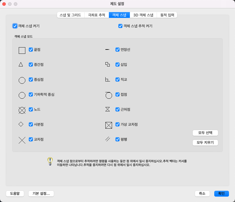 실행 중인 객체가 스냅될 때 설정할 수 있는 객체 스냅을 나열합니다.