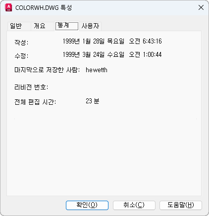 도면의 편집에 걸린 전체 시간을 표시합니다. 이 값은 TDINDWG 시스템 변수에 저장됩니다.