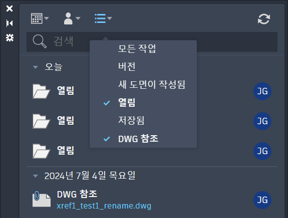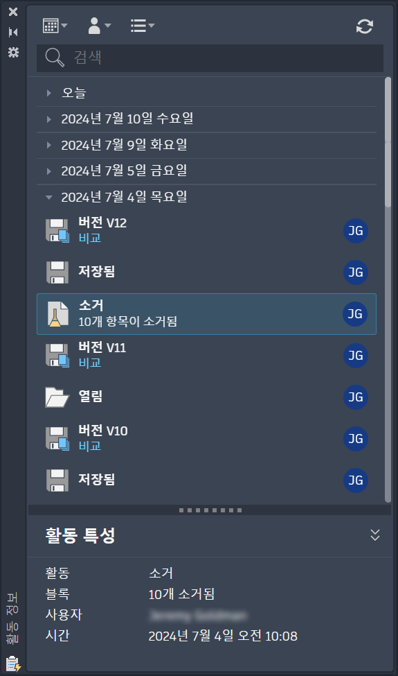 주: 현재 AutoCAD LT에서는 활동 정보 팔레트에 버전 활동만 표시합니다.