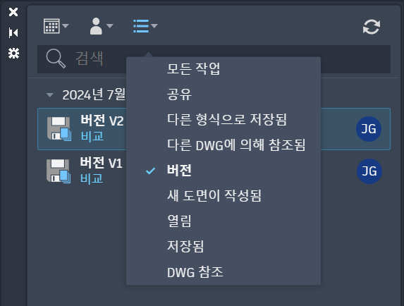 Autodesk Docs, Google Drive, OneDrive, Box 또는 Dropbox와 같은 지원되는 클라우드 저장소 공급자와 함께 활동 정보를 사용하면 저장할 때마다 각 도면의 새 버전이 기록됩니다. 각 버전 타일에서 비교를 클릭하여 이전 버전과 현재 버전을 쉽게 비교할 수 있습니다.
